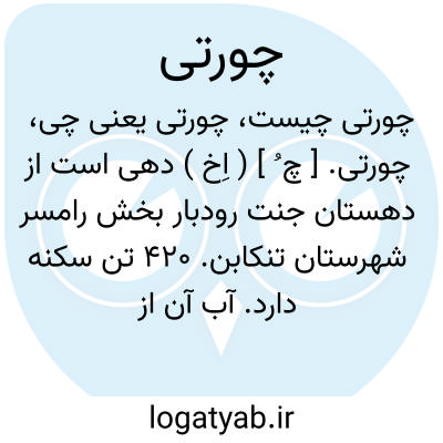چورتی. [ چ ُ ] ( اِخ ) دهی است از دهستان جنت رودبار بخش رامسر شهرستان تنکابن. 420 تن سکنه دارد. آب آن از چشمه سار. محصولاتش غلات، لبنیات، گردوو سیب زمینی است. ( از فرهنگ جغرافیائی ایران ج 3 ).