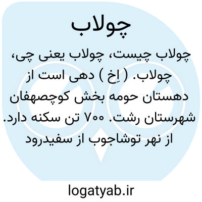 چولاب. ( اِخ ) دهی است از دهستان حومه بخش کوچصهفان شهرستان رشت. 700 تن سکنه دارد. از نهر توشاجوب از سفیدرود آبیاری میشود. محصولاتش برنج، ابریشم و غلات است. زیارتگاهی بنام امامزاده سیدقاسم دارد. ( از فرهنگ جغرافیایی ایران ج 2 ).