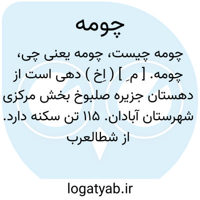 چومه. [ م ِ ] ( اِخ ) دهی است از دهستان جزیره صلبوخ بخش مرکزی شهرستان آبادان. 115 تن سکنه دارد. از شطالعرب آبیاری میشود. محصول عمده اش خرماست. ( از فرهنگ جغرافیائی ایران ج 6 ).