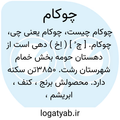 چوکام. [ چ ُ ] ( اِخ ) دهی است از دهستان حومه بخش خمام شهرستان رشت. 3850تن سکنه دارد. محصولش برنج، کنف، ابریشم، لبنیات و توتون سیگار است. ( از فرهنگ جغرافیائی ایران ج 2 ).