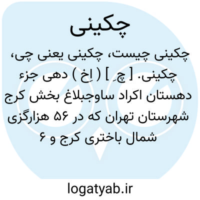 چکینی. [ چ ِ ] ( اِخ ) دهی جزء دهستان اکراد ساوجبلاغ بخش کرج شهرستان تهران که در 56 هزارگزی شمال باختری کرج و 6 هزارگزی جنوب راه شوسه کرج به قزوین واقع است و 75 تن سکنه دارد. آبش از قنات ورود کردان. محصولش غلات، بن شن، چغندر قند، صیفی و لبنیات. شغل اهالی زراعت و گله داری و راهش از طریق آبیک ماشین رو است. ( از فرهنگ جغرافیایی ایران ج 1 ).