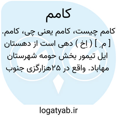 کامم. [ م ِ ] ( اِخ ) دهی است از دهستان ایل تیمور بخش حومه شهرستان مهاباد. واقع در 25هزارگزی جنوب مهاباد و یکهزار و پانصدگزی راه شوسه مهاباد به سردشت. ناحیه ای است کوهستانی و هوای آن معتدل است و چهل تن سکنه دارد. از چشمه مشروب میشود. محصول آن غلات، توتون، حبوبات است. اهالی به کشاورزی و گله داری گذران میکنند. راه آن ارابه رو است. ( از فرهنگ جغرافیائی ایران ج 4 ).