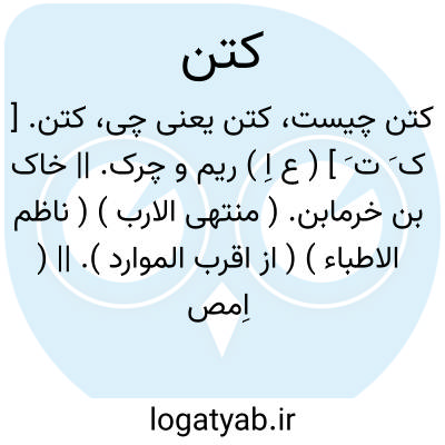 کتن. [ ک َ ت َ ] ( ع مص ) آلوده شدن لب به دود و سیاهی. ( از ناظم الاطباء ) ( از اقرب الموارد ). دود گرفتن. ( از اقرب الموارد ). || چرک گردیدن. ( از ناظم الاطباء ). چرک گرفتن. ( از اقرب الموارد ). || چسبیدن به لبهای شتر اثر سبزی گیاه. ( از ناظم الاطباء ) ( از اقرب الموارد ). || چسبان شدن چیز و ریمناک گردیدن. ( از ناظم الاطباء ). برچسبان شدن و ریمناک گردیدن. ( منتهی الارب ).