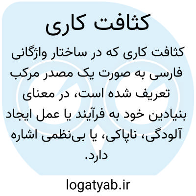 کثافت کاری که در ساختار واژگانی فارسی به صورت یک مصدر مرکب تعریف شده است، در معنای بنیادین خود به فرآیند یا عمل ایجاد آلودگی، ناپاکی، یا بی‌نظمی اشاره دارد. این اصطلاح، که ریشه در مفهوم کثافت دارد، دلالت بر هرگونه اقدامی دارد که منجر به تخریب محیط پیرامون، آلوده ساختن فضا، یا به‌هم‌ریختگی فیزیکی شود. این معنای تحت‌اللفظی، هرچند صریح است، اما در محاورات تخصصی‌تر یا ادبیات رسمی، کاربرد محدودتری یافته و معمولاً با واژگانی دقیق‌تر جایگزین می‌گردد تا وضوح بیشتری در انتقال مفهوم ناظر بر نظم و بی‌نظمی حاصل شود.