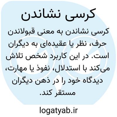 به کرسی گفته های خویش را بنشان و شاهی کن.تأثیر ( از مجموعه مترادفات ص 287 ).رجوع به ترکیب های ذیل کرسی شود.