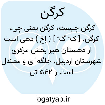 کرگن. [ ک َ گ َ ] ( اِخ ) دهی است از دهستان هیر بخش مرکزی شهرستان اردبیل. جلگه ای و معتدل است و 542 تن سکنه دارد. ( از فرهنگ جغرافیائی ایران ج 4 ).