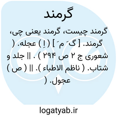گرمند. [ گ َ م َ ] ( اِ ) عجله. ( شعوری ج 2 ص 294 ). || جلد و شتاب. ( ناظم الاطباء ). || ( ص ) عجول. ( شعوری ج 2 ص 294 ). چالاک و تند. ( ناظم الاطباء ):