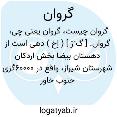 گروان. [ گ َرْ ] ( اِخ ) دهی است از دهستان بیضا بخش اردکان شهرستان شیراز، واقع در 60000گزی جنوب خاور اردکان و 5000گزی راه فرعی بیضا به زرقان. هوای آن معتدل و دارای 52 تن سکنه است. آب آنجا از چشمه تأمین میشود. محصول آن غلات، برنج، چغندر و تریاک و شغل اهالی زراعت و راه آن مالرو است. ( فرهنگ جغرافیایی ایران ج 7 ).