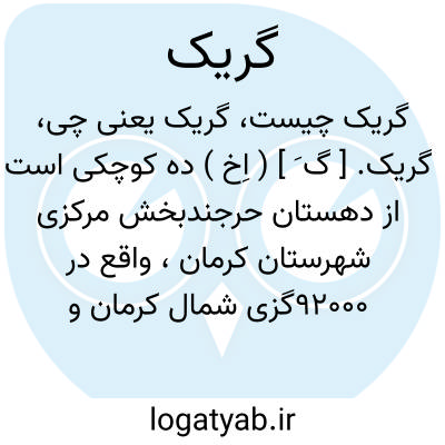 گریک. [ گ َ ] ( اِخ ) ده کوچکی است از دهستان حرجندبخش مرکزی شهرستان کرمان، واقع در 92000گزی شمال کرمان و 4000گزی راه مالرو شاهزاده محمد به کرمان و دارای 40 تن سکنه است. ( فرهنگ جغرافیایی ایران ج 8 ).