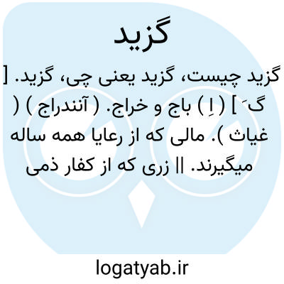 گزید. [ گ َ ] ( اِ ) باج و خراج. ( آنندراج ) ( غیاث ). مالی که از رعایا همه ساله میگیرند. || زری که از کفار ذمی ستانند. ( برهان ). جزیه که کفار ستانند. ( آنندراج ) ( غیاث ). رجوع به گزیت شود. || هدیه و تحفه و رشوت. ( برهان ).