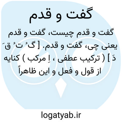 گفت و قدم. [ گ ُ ت ُ ق َ دَ ] ( ترکیب عطفی، اِ مرکب ) کنایه از قول و فعل و این ظاهراً اصطلاح قلندران ولایت است. ( آنندراج ):