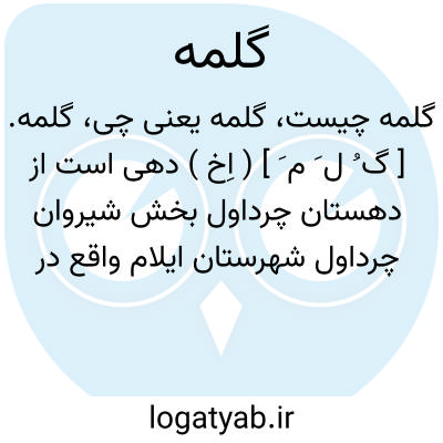 گلمه. [ گ ُ ل َ م َ ] ( اِخ ) دهی است از دهستان چرداول بخش شیروان چرداول شهرستان ایلام واقع در 11000گزی شمال باختری چرداول، کنار راه اتومبیل رو چرداول به آسان آباد. هوای آن گرم و دارای 200 تن سکنه است. آب آن از رودخانه چرداول و محصول آن غلات، لبنیات و حبوبات است. شغل اهالی زراعت و گله داری است. ( از فرهنگ جغرافیایی ایران ج 5 ).