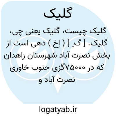 گلیک. [ گ ِ ] ( اِخ ) دهی است از بخش نصرت آباد شهرستان زاهدان که در 75000گزی جنوب خاوری نصرت آباد و 35000گزی باختر راه شوسه زاهدان به خاش واقع شده است. هوای آن گرم و سکنه اش 250 تن است. آب آنجا از قنات تأمین میشود. محصول آن غلات و ذرت وشغل اهالی زراعت و راه آن مالرو است. ساکنین از طایفه ناروئی هستند. ( از فرهنگ جغرافیایی ایران ج 8 ).