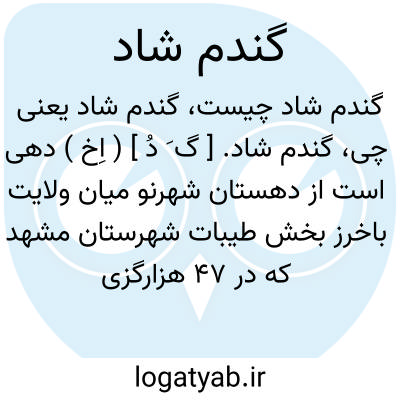 گندم شاد. [ گ َ دُ ] ( اِخ ) دهی است از دهستان شهرنو میان ولایت باخرز بخش طیبات شهرستان مشهد که در 47 هزارگزی شمال طیبات و یکهزارگزی جنوب اتومبیل رو طیبات به شهرنو واقع شده است. هوای آن معتدل و سکنه آن 722 تن است. آب آن از قنات تأمین می شود. محصول آن غلات، شغل اهالی زراعت و مالداری و راه آن اتومبیل رو است. ( از فرهنگ جغرافیایی ایران ج 9 ).