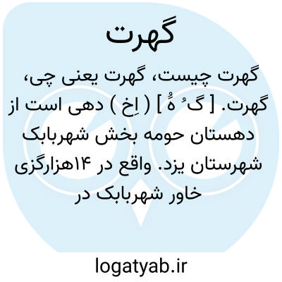 گهرت. [ گ ُ هَُ ] ( اِخ ) دهی است از دهستان حومه بخش شهربابک شهرستان یزد. واقع در 14هزارگزی خاور شهربابک در کنار راه فرعی شهربابک به خاتون آباد. محلی جلگه و هوای آن معتدل و سکنه آن 430 تن است. آب آن از قنات تأمین میشود. محصول عمده ٔآن غلات و شغل اهالی زراعت و صنایع دستی زنان کرباس و قالی بافی است. ( از فرهنگ جغرافیایی ایران ج 10 ).