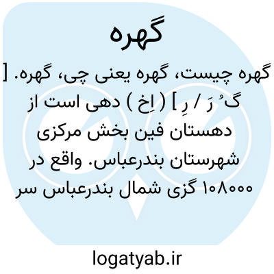 گهره. [ گ ُ رَ / رِ ] ( اِخ ) دهی است از دهستان فین بخش مرکزی شهرستان بندرعباس. واقع در 108000 گزی شمال بندرعباس سر راه شوسه کرمان به بندرعباس. محلی کوهستانی و هوای آن گرمسیر و سکنه آن 874 تن است. آب آن از قنات تأمین میشود. و محصول عمده آن خرما و مرکبات و شغل اهالی زراعت است.راه شوسه دارد. مزارع شورانی، دوین درانار، بیشه جزء برزن این ده است. دبستان، پاسگاه ژاندارمری، گمرگ و گارد مسلح دارد. ( از فرهنگ جغرافیایی ایران ج 8 ).