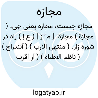 ( مجازة ) مجازة. [ م َ زَ ] ( ع اِ ) راه در شوره زار. ( منتهی الارب ) ( آنندراج ) ( ناظم الاطباء ) ( از اقرب الموارد ). || جای بسیارجوز. ( منتهی الارب ) ( آنندراج ). جای پر از درخت گردکان. ( ناظم الاطباء ) ( از اقرب الموارد ). || راه. مجاز. ( از اقرب الموارد ).