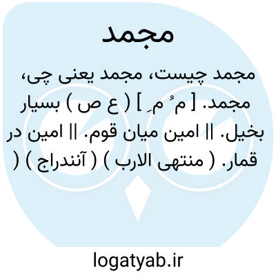 مجمد. [ م ُ م ِ ] ( ع ص ) بسیار بخیل. || امین میان قوم. || امین در قمار. ( منتهی الارب ) ( آنندراج ) ( ناظم الاطباء ) ( از اقرب الموارد ). || در ماه جمادی درآمده. ( منتهی الارب ) ( آنندراج ) ( ناظم الاطباء ).آن که به ماه جمادی داخل شده. ( از اقرب الموارد ).