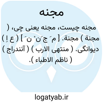 ( مجنة ) مجنة. [ م َ ج َن ْ ن َ ] ( ع اِ ) دیوانگی. ( منتهی الارب ) ( آنندراج ) ( ناظم الاطباء ). جنون. ( از اقرب الموارد ). و رجوع به جنون شود. || جای نهان شدن. ( منتهی الارب ) ( آنندراج ) ( ناظم الاطباء ) ( از اقرب الموارد ).