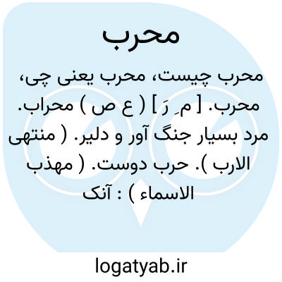 محرب. [ م ِ رَ ] ( ع ص ) محراب. مرد بسیار جنگ آور و دلیر. ( منتهی الارب ). حرب دوست. ( مهذب الاسماء ): آنک شجاع و محرب بود دست به سلاح برد و با دیو و پری کارزار کرد. ( سندبادنامه ص 320 ).