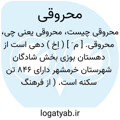 محروقی. [ م َ ] ( اِخ ) دهی است از دهستان بوزی بخش شادگان شهرستان خرمشهر دارای 846 تن سکنه است. ( از فرهنگ جغرافیایی ایران ج 6 ).