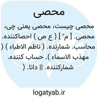 محصی. [ م ُ ] ( ع ص ) احصاکننده. محاسب. شمارنده. ( ناظم الاطباء ) ( مهذب الاسماء ). حساب کننده. شمارکننده. || دانا. ( مهذب الاسماء ). دریابنده و داننده. ( ناظم الاطباء ). || توانا. قوی. ( مهذب الاسماء ) ( ناظم الاطباء ).
