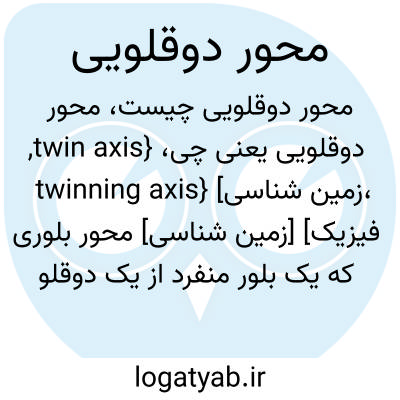 {twin axis, twinning axis} [زمین شناسی، فیزیک] [زمین شناسی] محور بلوری که یک بلور منفرد از یک دوقلو 180 درجه حول آن می چرخد [فیزیک] محوری که اگر یکی از بلورهای دوقلو حول آن بچرخد بر دیگری منطبق شود