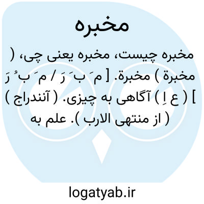 ( مخبرة ) مخبرة. [ م َ ب َ رَ / م َ ب ُ رَ ] ( ع اِ ) آگاهی به چیزی. ( آنندراج ) ( از منتهی الارب ). علم به چیزی. ( ناظم الاطباء ) ( از اقرب الموارد ). || درون چیزی. نقیض منظر. ( آنندراج ) ( از منتهی الارب )( از اقرب الموارد ). درون هر چیز. ( ناظم الاطباء ). || جای آزمایش. ( ناظم الاطباء ) ( از فرهنگ جانسون ). || هنر. ( دهار چ بنیاد فرهنگ ایران ).