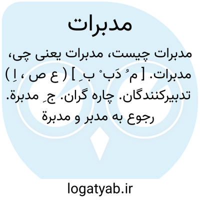 ( اسم ) جمع مدبره ( مدبر ): ۱- تدبیر کنندگان. ۲- نفوس فلکیه وانسیه. یا مدبرات انواع. ارباب انواع. یا مدبرات سفلیه. نفوس ناطقه. یا مدبرات علویه. ۱ - نفوس ناطق. فلکیه. ۲ - عقول مجرد. عرضیه.
