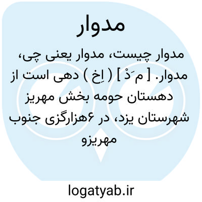 مدوار. [ م َدْ ] ( اِخ ) دهی است از دهستان حومه بخش مهریز شهرستان یزد، در 6هزارگزی جنوب مهریزو 14هزارگزی غرب جاده یزد به انار، در جلگه معتدل هوائی واقع است و 201 تن سکنه دارد. آبش از قنات تأمین می شود. محصولش غلات و شغل اهالی زراعت و کرباس بافی و نساجی است. ( از فرهنگ جغرافیایی ایران ج 10 ).