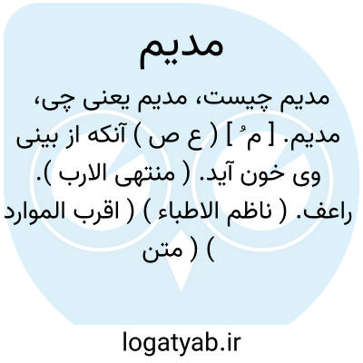 مدیم. [ م ُ ] ( ع ص ) آنکه از بینی وی خون آید. ( منتهی الارب ). راعف. ( ناظم الاطباء ) ( اقرب الموارد ) ( متن اللغة ). || فرونشاننده جوشش دیگ به آب سرد. ( آنندراج ). نعت فاعلی است از ادامة. || باران پیوسته بارنده. ( آنندراج ). رجوع به ادامة شود. || مبتلا به دوران سر. ( آنندراج ). ادیم به ( مجهولا )؛ مبتلا به دوران سر گردید. ( منتهی الارب ).
