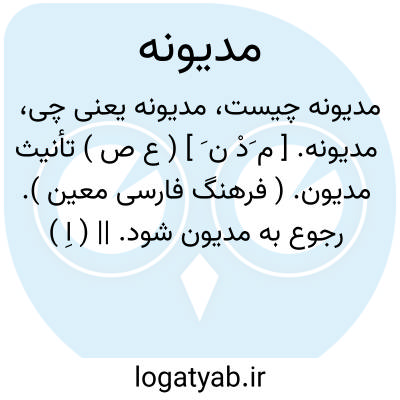 مدیونه. [ م َدْ ن َ ] ( ع ص ) تأنیث مدیون. ( فرهنگ فارسی معین ). رجوع به مدیون شود. || ( اِ ) داه. کنیز. ( ناظم الاطباء ). || ( اِخ ) قبیله ای از بربر. ( یادداشت مؤلف ).