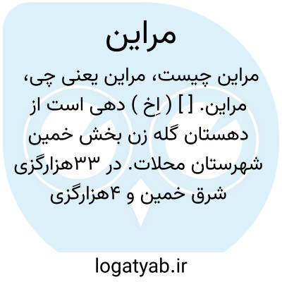 مراین. [ ] ( اِخ ) دهی است از دهستان گله زن بخش خمین شهرستان محلات. در 33هزارگزی شرق خمین و 4هزارگزی راه خمین به دلیجان، در جلگه معتدل هوائی واقع و دارای 455 تن سکنه است. آبش از رودخانه گلپایگان و محصولش غلات، بنشن، چغندر قند، تنباکو، پنبه، مختصر انگور و شغل مردمش زراعت، قالیچه و کرباس بافی است. ( از فرهنگ جغرافیایی ایران ج 1 ).