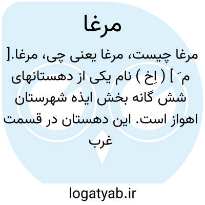 مرغا.[ م َ ] ( اِخ ) نام یکی از دهستانهای شش گانه بخش ایذه شهرستان اهواز است. این دهستان در قسمت غرب ایذه وشرق مسجد سلیمان در کوهستان واقع و هوای آن گرمسیر و آب اکثر قراء آن از رودخانه و چشمه. محصول عمده آن گندم، جو، برنج است. این دهستان از 53 آبادی بزرگ وکوچک تشکیل شده و جمعیت آن در حدود 8000 نفر است. قراء مهم آن به شرح زیر است. دوبلوطان، شیرازه، شب تیز، کنار پیر، گوری. ( از فرهنگ جغرافیایی ایران ج 6 ).