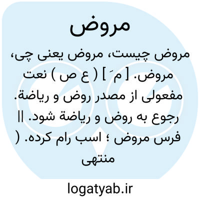 مروض. [ م ُ رَوْ وَ ] ( ع ص ) نعت مفعولی از مصدر ترویض. رجوع به ترویض و مَروض شود.ریاضت داده شده. ( غیاث ) ( آنندراج ). کره اسب مطیع و مسخرشده و راه رفتن را آموخته. ( از اقرب الموارد ).