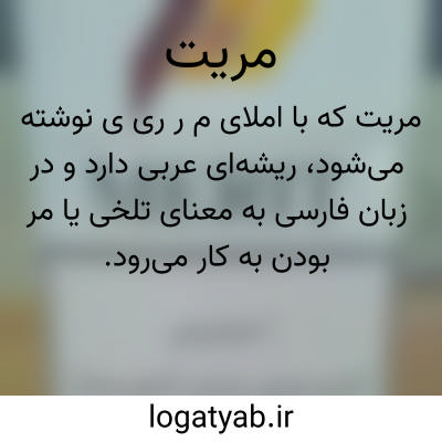 مریت که با املای [ م ُرْ ری ی َ ] نوشته می‌شود، ریشه‌ای عربی دارد و در زبان فارسی به معنای تلخی یا مُرّ بودن به کار می‌رود. این واژه، که به صورت مصدر جعلی یا اِمص نیز شناخته می‌شود، اشاره به طعم تلخ یا خاصیت تلخندگی دارد. در منابع لغوی مانند ناظم الاطباء، این مفهوم با صراحت بیشتری بیان شده و بر تلخ بودن تأکید گردیده است.