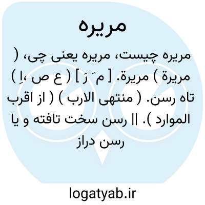 ( مریرة ) مریرة. [ م َ رَ ] ( ع ص،اِ ) تاه رسن. ( منتهی الارب ) ( از اقرب الموارد ). || رسن سخت تافته و یا رسن دراز باریک. ( منتهی الارب ) ( از اقرب الموارد ). || ارجمندی نفس. ( منتهی الارب ). عزت نفس. ( اقرب الموارد ). || چیرگی. ( منتهی الارب ). || آهنگ و عزیمت. ( منتهی الارب ) ( از اقرب الموارد ). ج، مَرائر. ( اقرب الموارد ).
