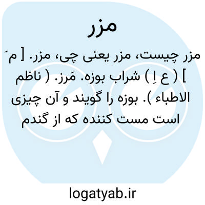 مزر. [ م ِ] ( ع ص ) گول. ( منتهی الارب ) ( آنندراج ). گول. احمق. ( از اقرب الموارد ) ( ناظم الاطباء ). || ( اِ ) اصل و نژاد هر چیزی. ( منتهی الارب ) ( از اقرب الموارد )( آنندراج ) ( ناظم الاطباء ). || بوزه و شراب ذرت و جو. ( ناظم الاطباء ). بگنی ارزن و جو که به عربی نبید خوانند. ( آنندراج ). بگنی ارزن و جو. ( منتهی الارب ). شراب جو و گندم و حبوب. ( از اقرب الموارد ). نبیذ گاورس. و گویند شرابی که از گندم و جو کنند. ( از یادداشت به خط مرحوم دهخدا ). بوزه. ( یادداشت به خط مرحوم دهخدا ). قسمی از آب جو. ( از دزی ج 2 ص 587 ). آب جو. ( نشوءاللغة ص 95 ).
