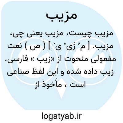 مزیب. [ م ُ زَی ْ ی َ ] ( ص ) نعت مفعولی منحوت از «زیب » فارسی. زیب داده شده و این لفظ صناعی است، مأخوذ از «زیب » که کلمه فارسی است از عالم مزلف و مششدر و ملبب. ( آنندراج ) ( غیاث ).