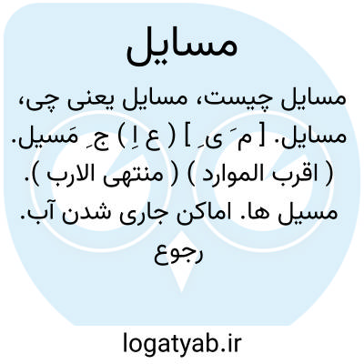 ( اسم ) جمع مساله ( مسئله ): حلاج بر سردار این نکته خوش سراید از شافعی مپرسید امثال این مسائل (مسایل ). ( حافظ )