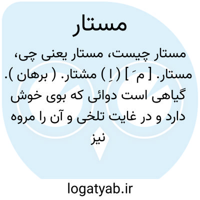 مستار. [ م َ ] ( اِ ) مشتار. ( برهان ). گیاهی است دوائی که بوی خوش دارد و در غایت تلخی و آن را مروه نیز گویند. ( جهانگیری ). گیاهی است دوائی و بوی خوشی دارد و در غایت تلخی هم هست و آن را مرو گویند. ( برهان ). به هندی افسنتین است. ( مخزن الادویه ):
