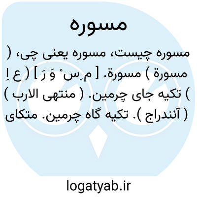 ( مسورة ) مسورة. [ م ِس ْ وَ رَ ] ( ع اِ ) تکیه جای چرمین. ( منتهی الارب ) ( آنندراج ). تکیه گاه چرمین. متکای چرمین. ( ناظم الاطباء ). بالش چرمین. ( مهذب الاسماء ). بالش نشستنی. نهالیچه. ( زمخشری ). بالش چرمین. ( مهذب الاسماء ). بالش تکیه. ج، مساور. و رجوع به مسور شود.