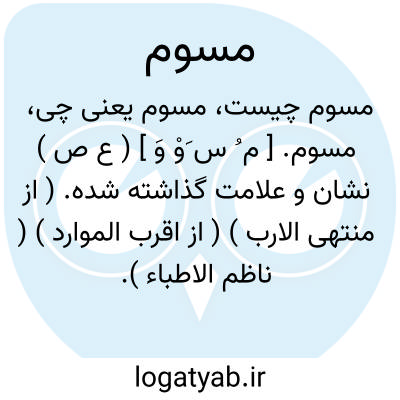 مسوم. [ م ُ س َوْ وَ ] ( ع ص ) نشان و علامت گذاشته شده. ( از منتهی الارب ) ( از اقرب الموارد ) ( ناظم الاطباء ). داغدار. || اسب به چرا گذاشته شده. ( از منتهی الارب ) ( از اقرب الموارد ). به چرا گذاشته شده. ( ناظم الاطباء ).