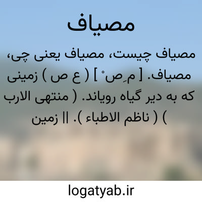مصیاف. [ م ِص ْ ] ( ع ص ) زمینی که به دیر گیاه رویاند. ( منتهی الارب ) ( ناظم الاطباء ). || زمین باران تابستانی رسیده. ( منتهی الارب ) ( ناظم الاطباء ) ( آنندراج ). || مردی که ازدواج نپذیرد تا دوموی نگردد. ( منتهی الارب ). مردی که زن نگیرد تا دوموی نگردد. ( ناظم الاطباء ). || ناقة مصیاف؛ ماده شتر بچه دار. ( از منتهی الارب ) ( ناظم الاطباء ).