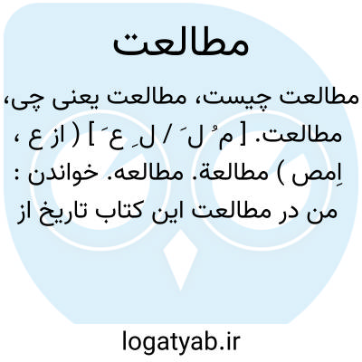مطالعة. [ م ُ ل َ ع َ ] ( ع مص ) طِلاع. واقف گردیدن. ( منتهی الارب ) ( از آنندراج ) ( المصادر زوزنی ) ( یادداشت به خط مرحوم دهخدا ). || به چیزی نگریستن برای وقوف یافتن بر آن. ( آنندراج ). پیوسته در چیزی نگریستن. ( تاج المصادر بیهقی ). || چیزی به کسی نوشتن تا واقف گردد. ( منتهی الارب ) ( از المصادر زوزنی ) ( از تاج المصادر بیهقی ). || ظاهر کردن حال را. ( منتهی الارب ) ( آنندراج ). و رجوع به مطالعت و مطالعه شود.