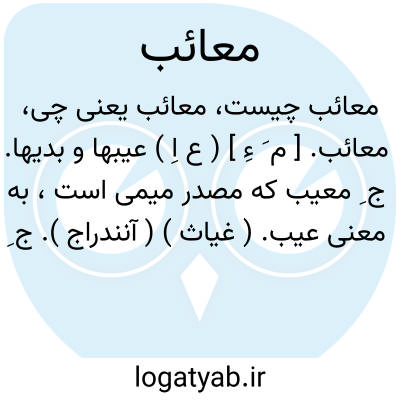 لغت نامه دهخدا معائب. [ م َ ءِ ] ( ع اِ ) عیبها و بدیها. ج ِ معیب که مصدر میمی است، به معنی عیب. ( غیاث ) ( آنندراج ). ج ِ مَعاب و مَعابَة. ( منتهی الارب ). و رجوع به معاب و معابة و معایب شود.