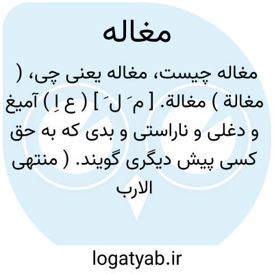 ( مغالة ) مغالة. [ م َ ل َ ] ( ع اِ ) آمیغ و دغلی و ناراستی و بدی که به حق کسی پیش دیگری گویند. ( منتهی الارب ) ( آنندراج ) ( ناظم الاطباء ). خیانت و غِش. ( اقرب الموارد ). || ( مص ) دروغ بربافتن و بد گفتن به حق کسی نزد سلطان یا عام است. مَغل. ( منتهی الارب ) ( از ناظم الاطباء ) ( از اقرب الموارد ).