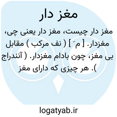 مغزدار. [ م َ ] ( نف مرکب ) مقابل بی مغز، چون بادام مغزدار. ( آنندراج ). هر چیزی که دارای مغز باشد وچیزی که پرمغز باشد. ( ناظم الاطباء ). دارای مغز. مغزآکنده. پرمغز. زاهق. ( یادداشت به خط مرحوم دهخدا ).