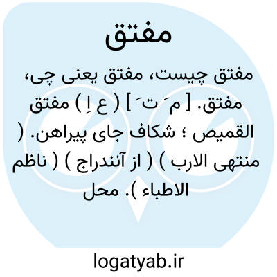 لغت نامه دهخدا مفتق. [ م َ ت َ ] ( ع اِ ) مفتق القمیص؛ شکاف جای پیراهن. ( منتهی الارب ) ( از آنندراج ) ( ناظم الاطباء ). محل شکافتگی پیراهن. ( از اقرب الموارد ).مفتق. [ م ُ ف َت ْ ت َ ] ( ع ص ) گشوده. شکافته. بازکرده: با بوی شمال کس نخواند خوش مشک و می نافه مفتق را.قطران ( دیوان چ محمد نخجوانی ص 12 ).و رجوع به تفتیق شود.
