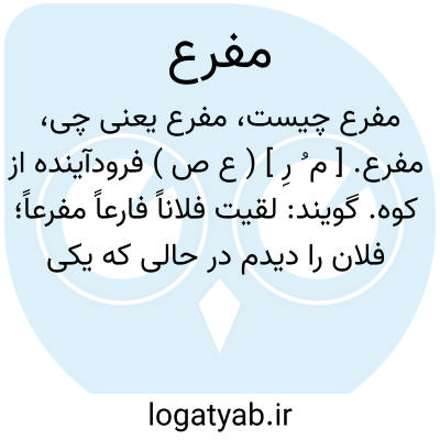 مفرع. [ م ُ رِ ] ( ع ص ) فرودآینده از کوه. گویند: لقیت فلاناً فارعاً مفرعاً؛ فلان را دیدم در حالی که یکی ازما دو نفر از کوه بالا می رفت و دیگری فرودمی آمد. ( ازمنتهی الارب ) ( از ناظم الاطباء ) ( از اقرب الموارد ).